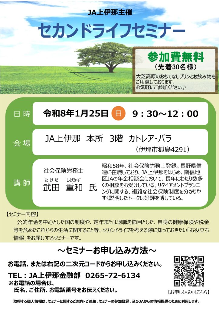 JA上伊那では毎年好評の「セカンドライフセミナー」を下記のとおり開催いたします。